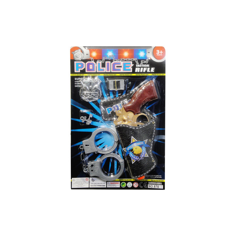 Pistolet policyjny w kaburze, z policyjną odznaką i kajdankami. Produkt zapakowany w kartonową podstawkę z przezroczystym kloszem. Zabawka dla dzieci od 3 lat.