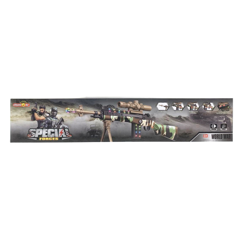 Zabawka karabin dla dzieci, który będzie świetną zabawką do odgrywania ról żołnierzy armii i pozorowanych bitew. Karabin posiada także migające światła na lufie, a naciśnięcie spustu spowoduje realistyczne dźwięki wystrzału. Zabawka działa na baterie typu AA. Baterie nie są załączone do zabawki. Produkt przeznaczony dla dzieci od 3 lat. Zabawka zapakowana w kartonowe opakowanie. Podane wymiary są wymiarami opakowania.
