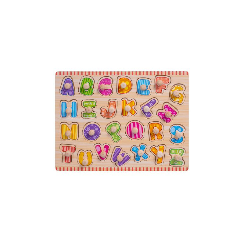 Drewniana układanka Literki to kolorowe puzzle, które pomogą dziecku poznać kształt literek oraz zapamiętać ich kolejność w alfabecie. W drewnianej tablicy wycięto otwory o kształcie kolejnych znaków alfabetu. Litery należy dopasować do odpowiednich otworów. Pomagają w tym doczepione do puzzli uchwyty. Dziecko umieszczając daną literkę w miejscu, do którego ona pasuje, uczy się równocześnie rozpoznawania i dopasowywania kształtów, a także zapamiętuje kolejność liter.
