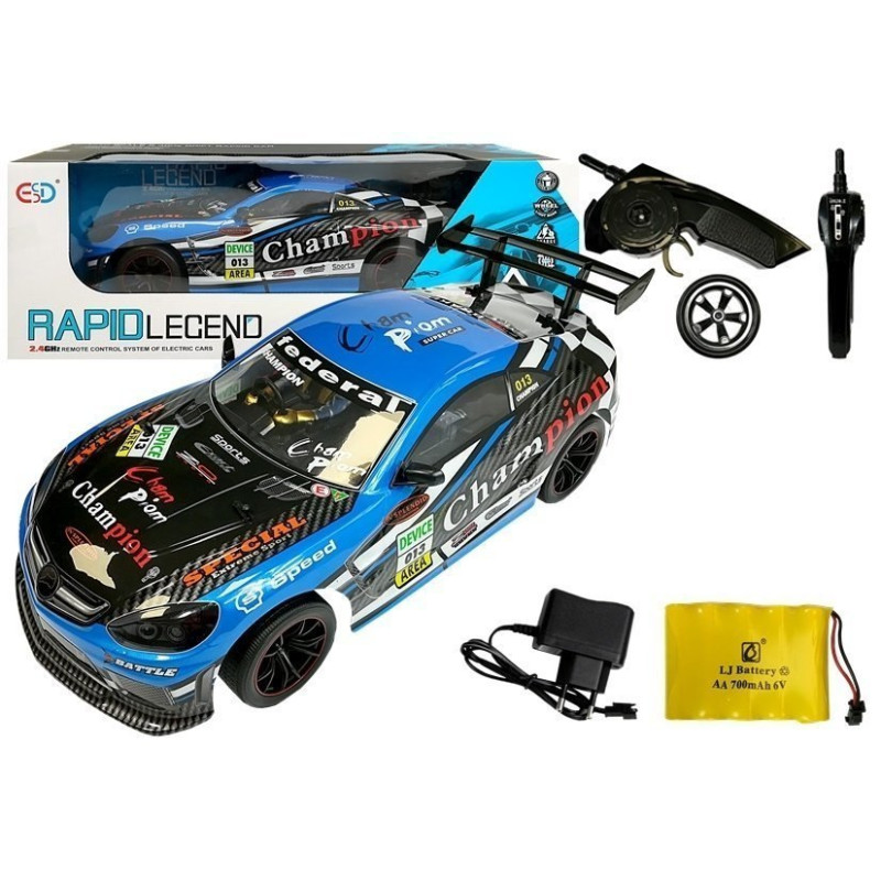 Pilot dołączony do wyścigowego zestawu odbiera na częstotliwości 2,4G co redukuje wszelkie zakłócenia podczas zabawy. Przyciskami możemy sterować przód — tył oraz prawo — lewo. Intensywny niebieski kolor z interesującymi nalepkami, otwarty wygląd silnika i opływowy kształt daje ikry naszej wyścigówce.