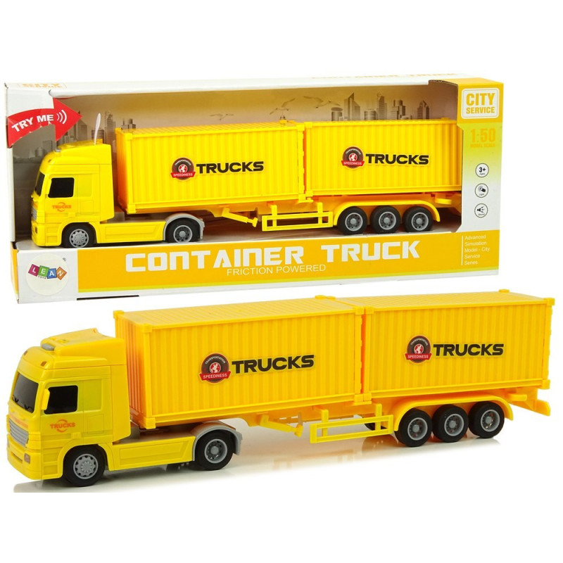 Autko wygląda jak prawdziwa ciężarówka. Realistyczny model wykonany został z dużą precyzją. Gwarantuje świetną zabawę oraz w bezpieczny sposób pozwala zapoznać mu się ze światem realnym. Na dachu ciężarówki znajduje się przycisk. Po naciśnięciu pojawiają się efekty świetlne i dźwiękowe takie jak odpalanie i odgłos pracy silnika. Wprawią twoje dziecko w lepszy nastrój, a i rozwiną zmysł słuchu i wzroku. Będzie dużo chętniej bawił się ciężarówką ! Porusza się napędem frykcyjnym. Wystarczy pociągnąć zabawkę po podłożu w tył i pojazd zacznie jechać. Podczas postoju można opuścić nogi dla stabilniejszej postawy. Odpinane naczepy dają wiele możliwości zabawy, w trasę można wyruszyć pojedynczo, z dwoma kontenerami bądź samą ciężarówką.