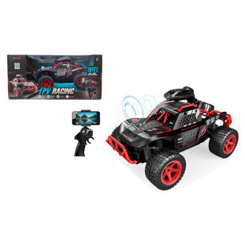 Zdalnie sterowany samochód wyścigowy FPV Racing z kamerą WiFi. Umożliwia podgląd jazdy w czasie rzeczywistym przez smartfon. Wyposażony w pilot z uchwytem na telefon. Auto działa na baterie typu AA (niezałączone) oraz Ni-Cd (załączone). Zabawka przeznaczona dla dzieci od lat 6. Całość zapakowana w kartonowe pudełko. Podane wymiary są wymiarami opakowania.