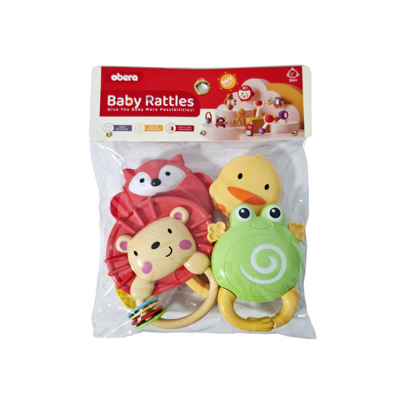 Zestaw kolorowych grzechotek w kształcie zwierzątek. W komplecie kilka różnych grzechotek o zróżnicowanych kształtach i kolorach, przeznaczonych do zabawy i chwytania. Zabawka przeznaczona dla dzieci od 3 miesiąca życia. Grzechotki zapakowane w przezroczysty worek. Podane wymiary są wymiarami produktu w opakowaniu.