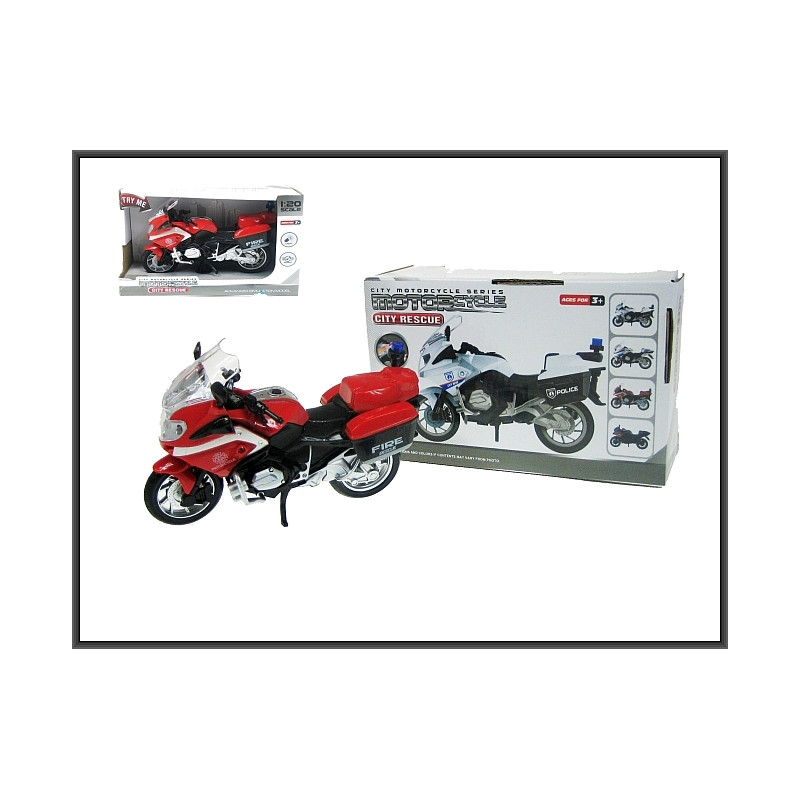 Motocykl plastykowy 18x10x7cm w skali 1:20 ze światłem oraz z dźwiękami : odpalania silnika i syreny strażackiej .