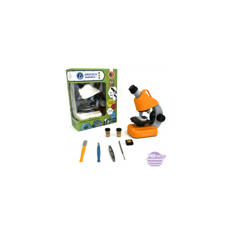Mikroskop do nauki i zabawy. Zestaw składa się z prawdziwego mikroskopu oraz niezbędnych akcesoriów do przeprowadzenia badań i obserwacji. Mikroskop przybliża 100x , 400x oraz 1200x krotnie. Zabawka rozwija u dziecka umiejętności technologiczne, inżynierii oraz ścisły umysł matematyczny fascynując nauką i poznawaniem wszechświata mikro i makro.