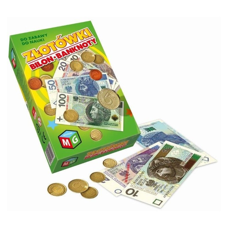 Imitacja polskich pieniędzy w bilonie i w banknotach. Produkt nadaje się doskonale do zabawy i może być wykorzystany jako atrakcyjny rekwizyt różnego rodzaju gier. Jest także cenną pomocą dydaktyczną w poznaniu pierwszych informacji na temat operacji pieniężnych. Zawartość pudełka: 25 banknotów 10 zł, 25 banknotów 20 zł, 25 banknotów 50 zł, 25 banknotów 100 zł, 25 banknotów 200 zł, 4 monety 5 zł, 4 monety 2 zł, 4 monety 1 zł, 4 monet 50 gr, 4 monety 20 gr, 4 monety 10 gr, 4 monety 5 gr, 4 monety 2 gr, 4 monety 1 gr.