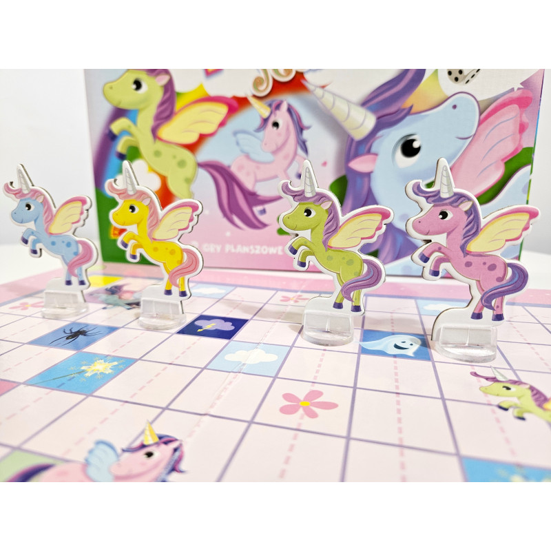 Magiczne Jednorożce to dwie gry planszowe pod wspólnym tytułem, skierowane do młodszych dzieci. Zasady gier są bardzo proste, ale cel jest różny. W pierwszej grze gracze – Jednorożce starają się zebrać jak najszybciej 10 gwiazdek, by rozświetlić nocne niebo. W tej grze dodatkową dawkę emocji daje możliwość wyboru, która łączy się jednak z ryzykiem. W drugiej grze Jednorożce wybierają się w podróż. Droga jest pełna emocjonujących niespodzianek, które mogą zdecydować o szybkości dotarcia do celu. W tej grze wygra Jednorożec, który pierwszy stanie na mecie. Obie gry to gwarancja dobrej zabawy i wielu emocji.