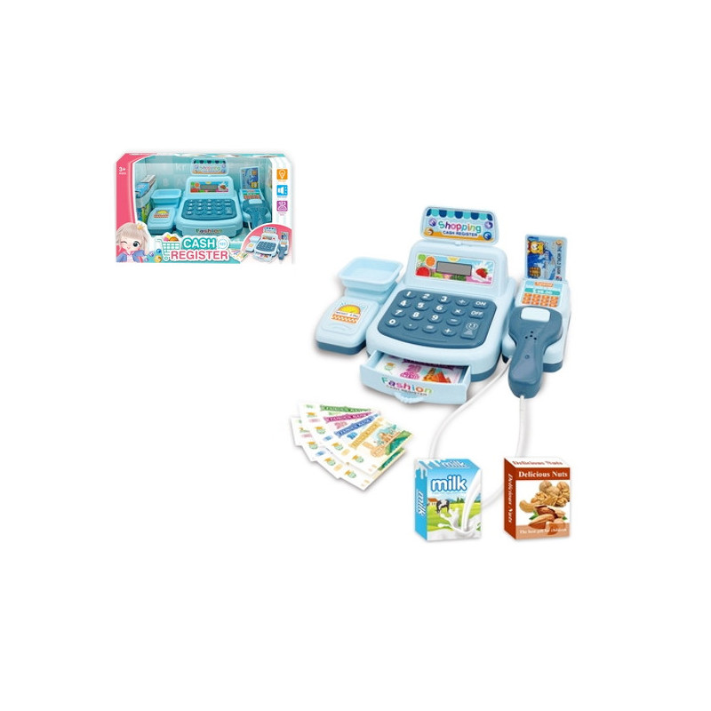 Kasa sklepowa ze skanerem i z akcesoriami (pieniędzmi, pudełka z mlekiem, ciasteczkami). Szuflada otwiera się ręcznie. Skaner świeci kolorowym światełkiem i wydaje dźwięki. Zabawka działa na baterie typu AA. Baterie nie są załączone do zabawki. Podane wymiary są wymiarami opakowania. Zabawka dla dzieci od 3 lat. Zabawka zapakowana w kartonowe opakowanie z okienkiem.