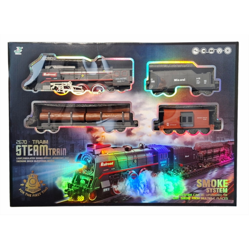 Zestaw pociągu parowego z lokomotywą i trzema wagonami. Posiada efekty świetlne, dźwiękowe oraz funkcję wydobywania dymu. Zabawka działa na baterie typu AA. Baterie nie są załączone do zabawki. Produkt zapakowany w kartonowe pudełko. Podane wymiary są wymiarami opakowania.