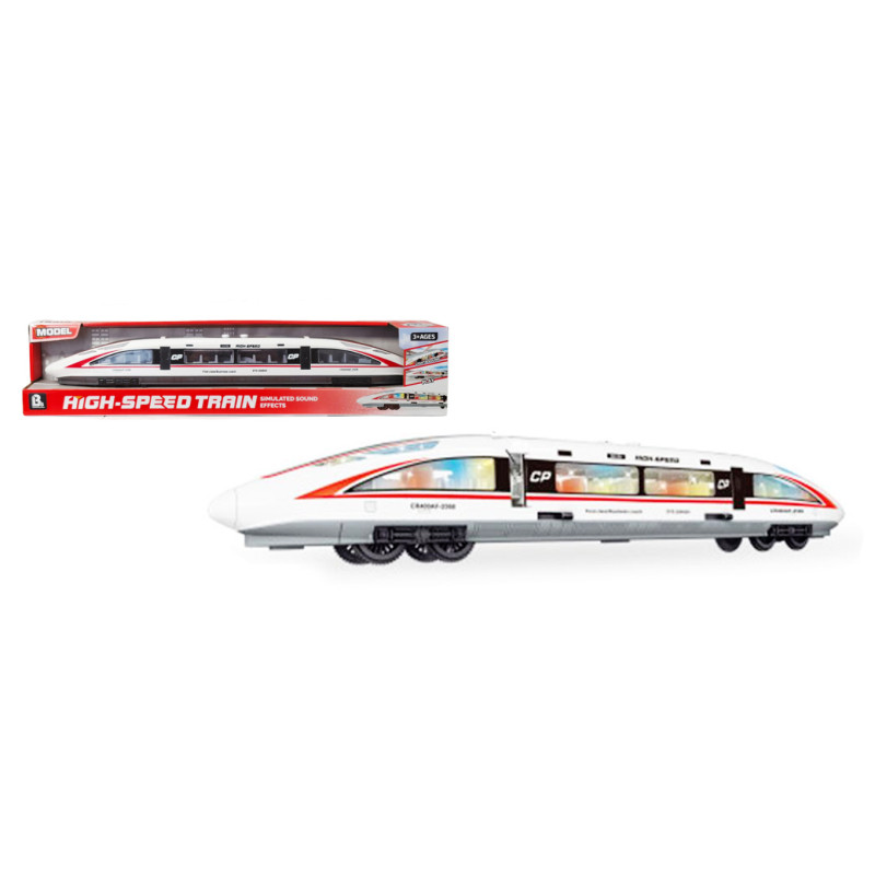 Nowoczesny pociąg pasażerski z efektami świetlnymi i dźwiękowymi.