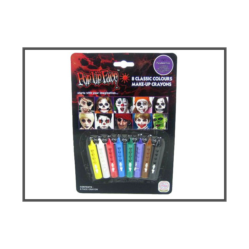 Kredki do malowania twarzy. W 8 kolorach: żółty, biały, niebieski, czerwony, fioletowy, zielony, brązowy, czarny. Wymiary opakowania: 23x16cm