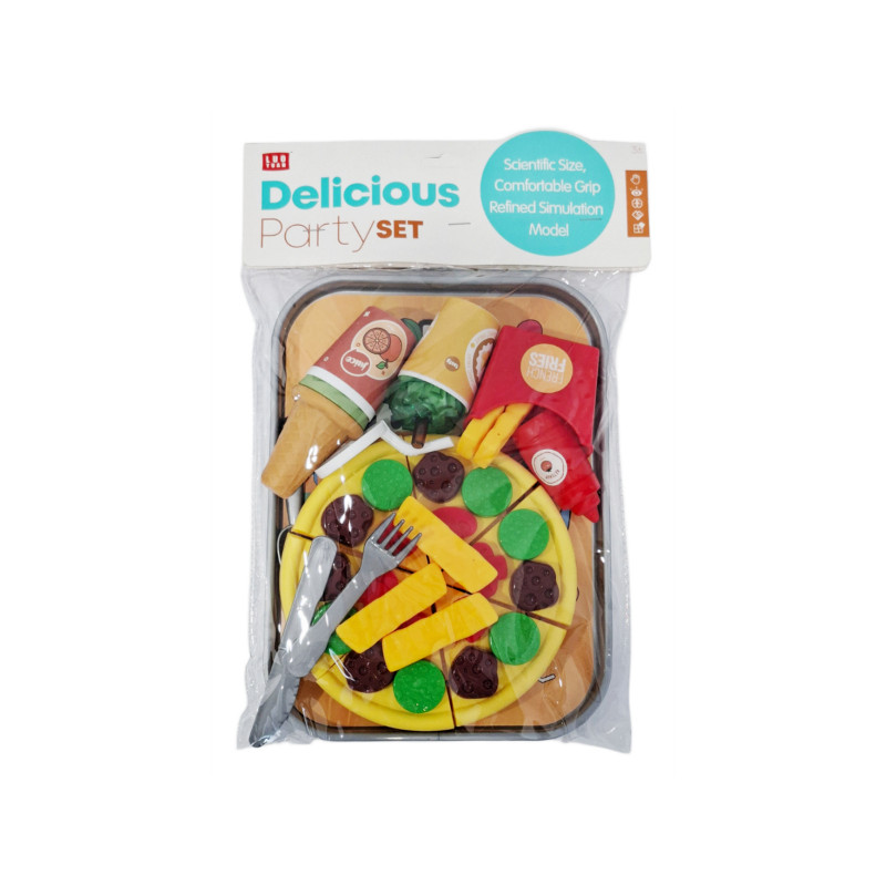 Zestaw produktów spożywczych z pizzą do krojenia, napojami, frytkami i sztućcami. Zabawka przeznaczona dla dzieci od lat 3. Produkt zapakowany w przezroczysty worek.
