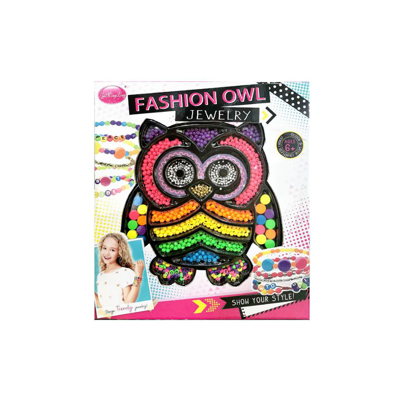 Kolorowe koraliki o różnej wielkości i kształcie do tworzenia unikatowych bransoletek. Zapakowane w kartonowe opakowanie w kształcie sowy. Zabawka dla dzieci od 3 lat. Produkt zapakowany w kartonowe opakowanie. Podane wymiary są wymiarami opakowania.