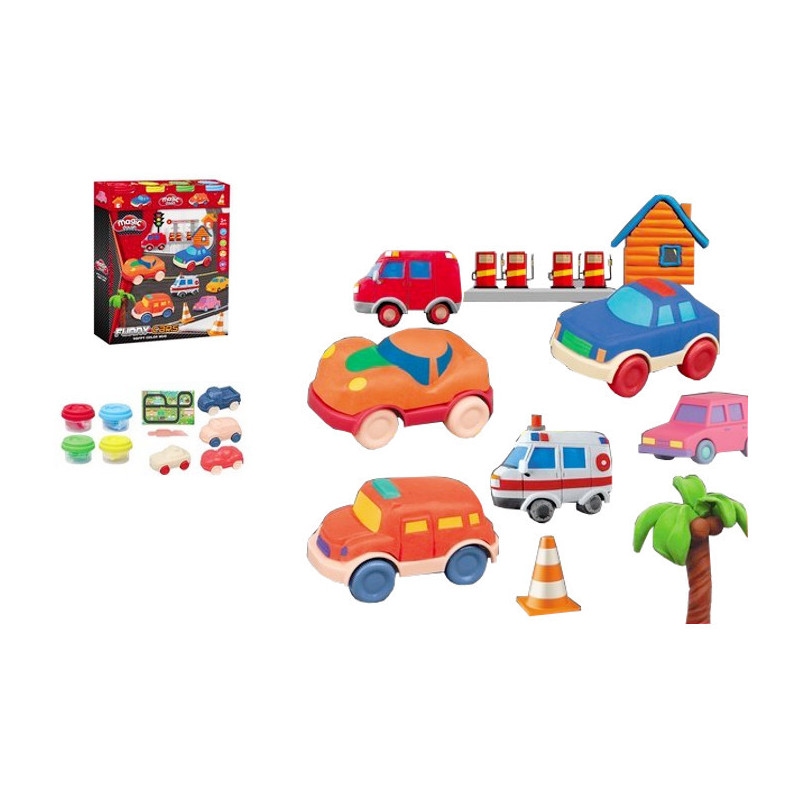 mas plastycznych z foremkami do tworzenia kolorowych pojazdów i akcesoriów