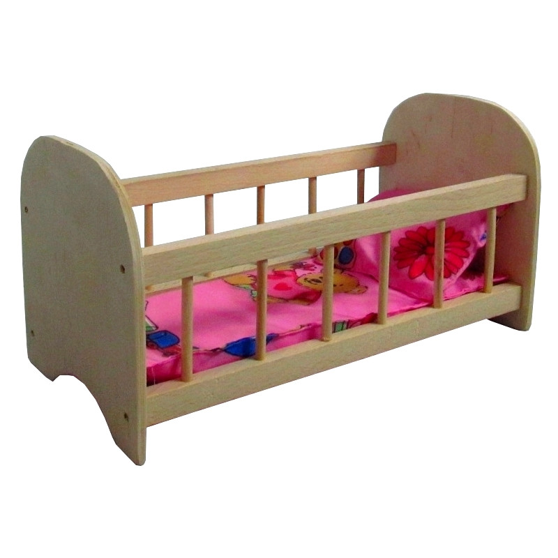 Łóżeczko wykonane z drewna, nielakierowane. Pościel z tkanin w różnych kolorach. Przeznaczone dla dziewczynek od 3 lat.