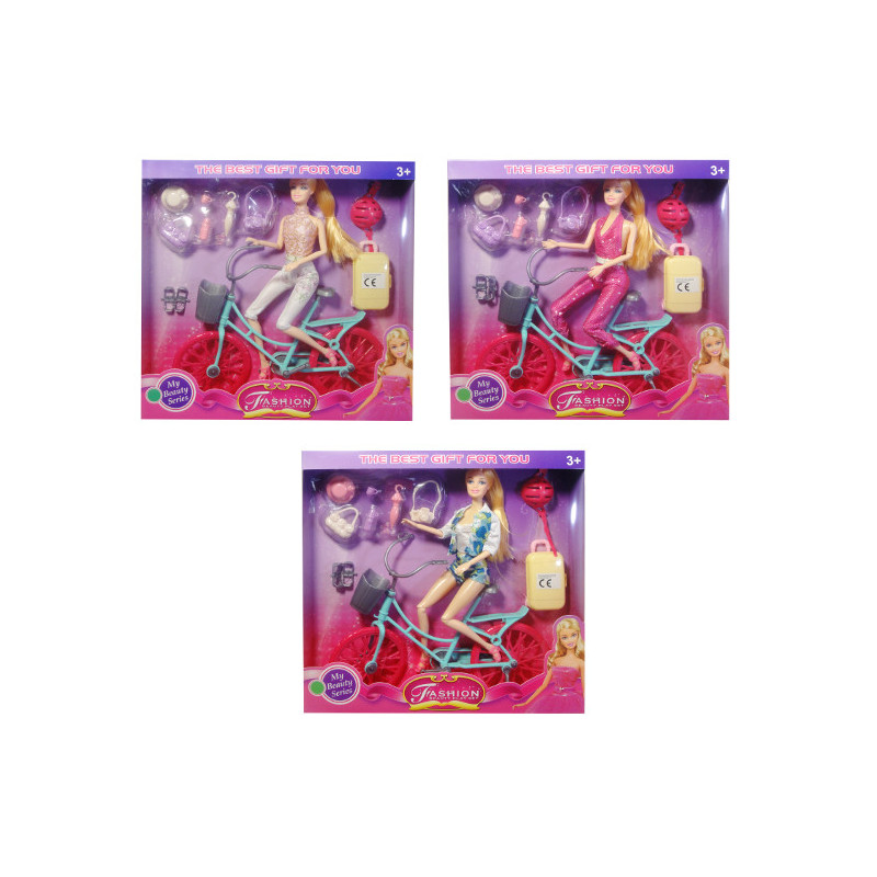 Lalka na rowerze w zestawie z akcesoriami podróżniczymi jak: walizka, aparat fotograficzny, torebka, kapelusz, parasol. Produkt zapakowany w kartonowe opakowanie z przezroczystym okienkiem