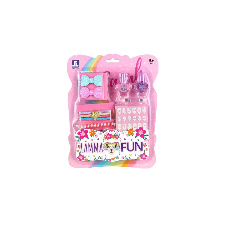 Zestaw składa się z dwóch lakierów do paznokci, naklejek oraz dwóch spinek i gumek do włosów.