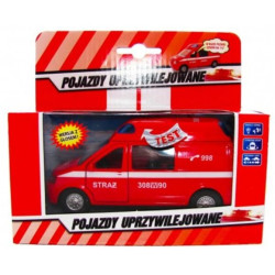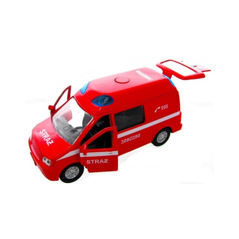 Wóz strażacki typu VAN w czerwonym kolorze.