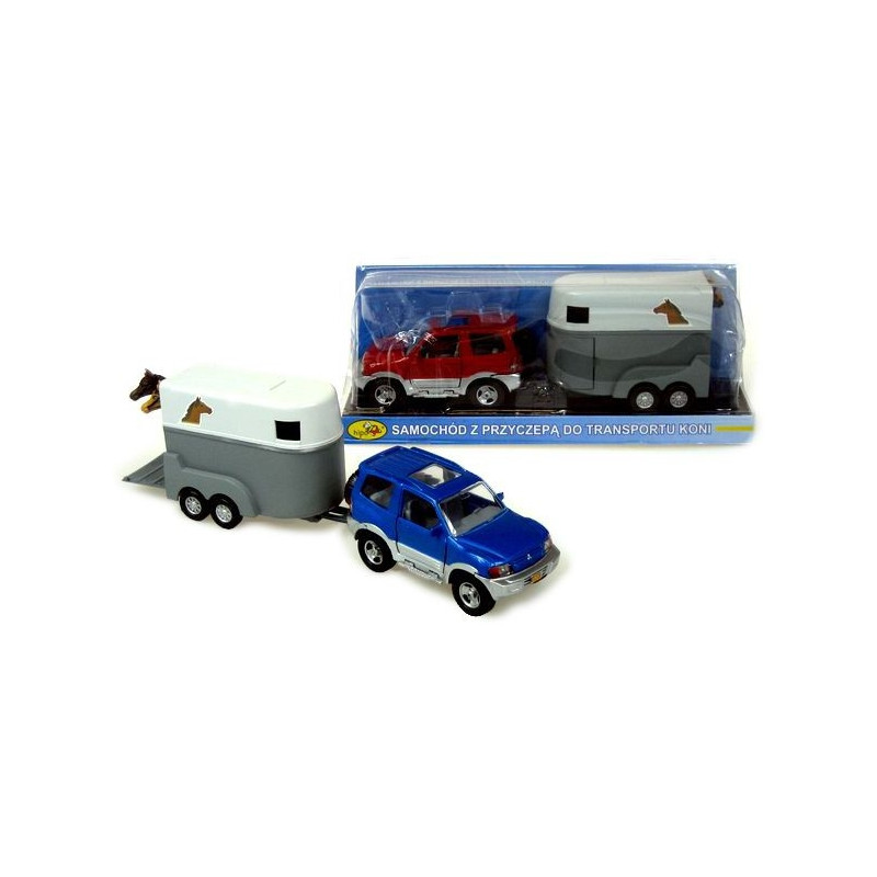 Auto metalowe Pajero 12x6x4cm z napędem i z przyczepą do transportu koni (10x8x4cm) plus dwa koniki .