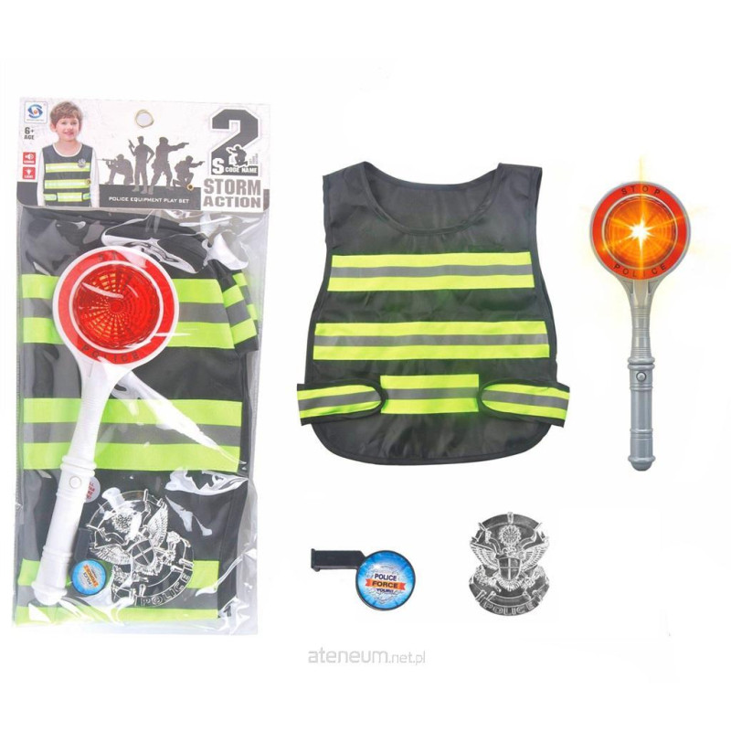 Komplet akcesoriów do kostiumu policjanta. Duży zestaw atrybutów policjanta: policyjny lizak ze światłem, kamizaelka odznaka