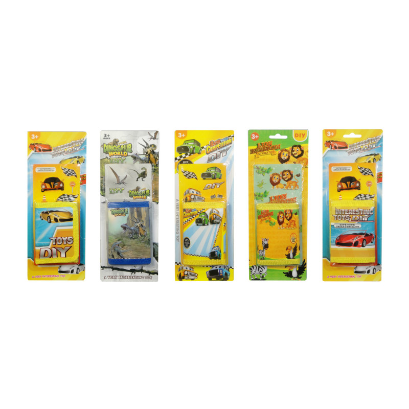 Zestaw portfel + ozdobne naklejki. Naklejkami dzieci będą mogły przyozdobić portfel lub inne prace rysunkowe. Produkt zapakowany w kartonową podstawkę z przezroczystym kloszem. Produkt występuje w kilku wersjach kolorystycznych, wybierany losowo. Cena dotyczy jednej sztuki. Zabawka dla dzieci od 3 lat.