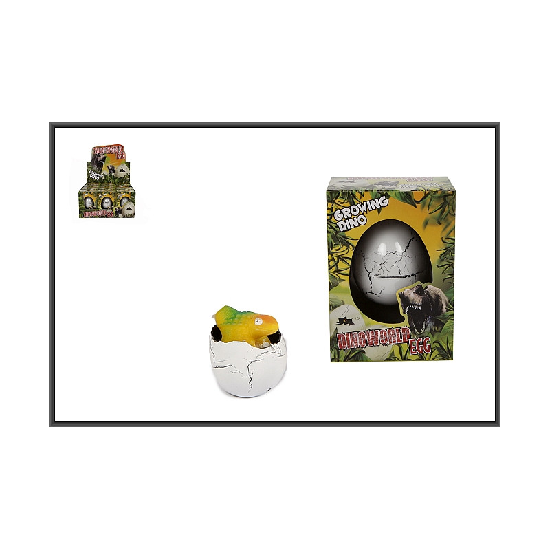 Jajko 6cm z dinozaurem pakowane pojedyńczo w pudełko. Jajko należy zanurzyć w wodzie. Po upływie 12-24 godzin skorupka zacznie pękać , a po 48 godzinach wykluje się z jajka dinozaur i będzie rósł w wodzie do wysokości szklanki.