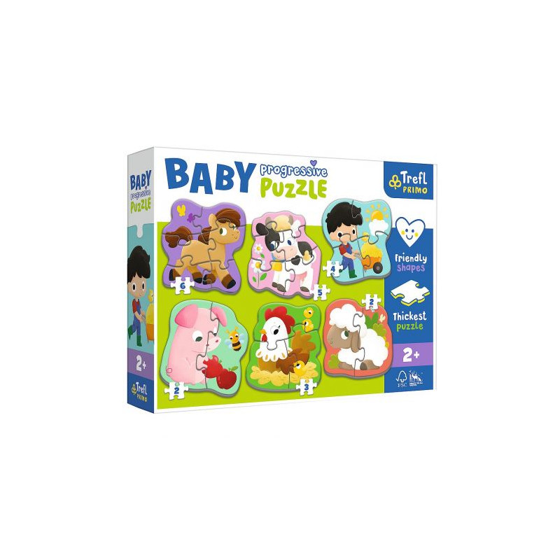 Zestaw zawiera 6 układanek składających się z 2, 3, 4, 5 lub 6 puzzli przeznaczonych dla dzieci od 2. roku życia. Zwiększające się ilości elementów i stopień trudności, sprawiają, że jest to idealny produkt do rozpoczęcia przygody z układaniem puzzli. Najgrubsza tektura na rynku oraz przyjazny kształt elementów, sprawiają, że puzzle idealnie pasują do małych rączek i są bezpieczne dla dziecka.