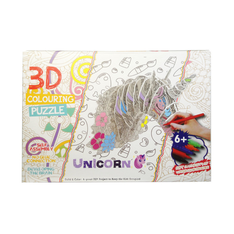 Zestaw zawiera puzzle do złożenia i pomalowania. Po złożeniu otrzymujemy jednorożca 3D. Do zestawu dołączone są pisaki w 10 kolorach. Produkt rozwija w dzieciach kreatywność. Produkt zapakowany w kartonowe opakowania. Przeznaczony dla dzieci od 6 lat. Podane wymiary są wymiarami opakowania.