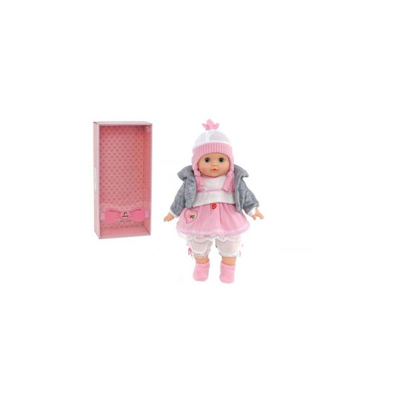Lalka bobas o wielkości 40 cm. Mówi i śpiewa po polsku. Ubrana jest w różową sukienkę, szary płaszczyk, czapkę i buty, Wymiary opakowania: 43,5 x 20 x 12 cm Baterie: 3 x LR 44 (w zestawie)
