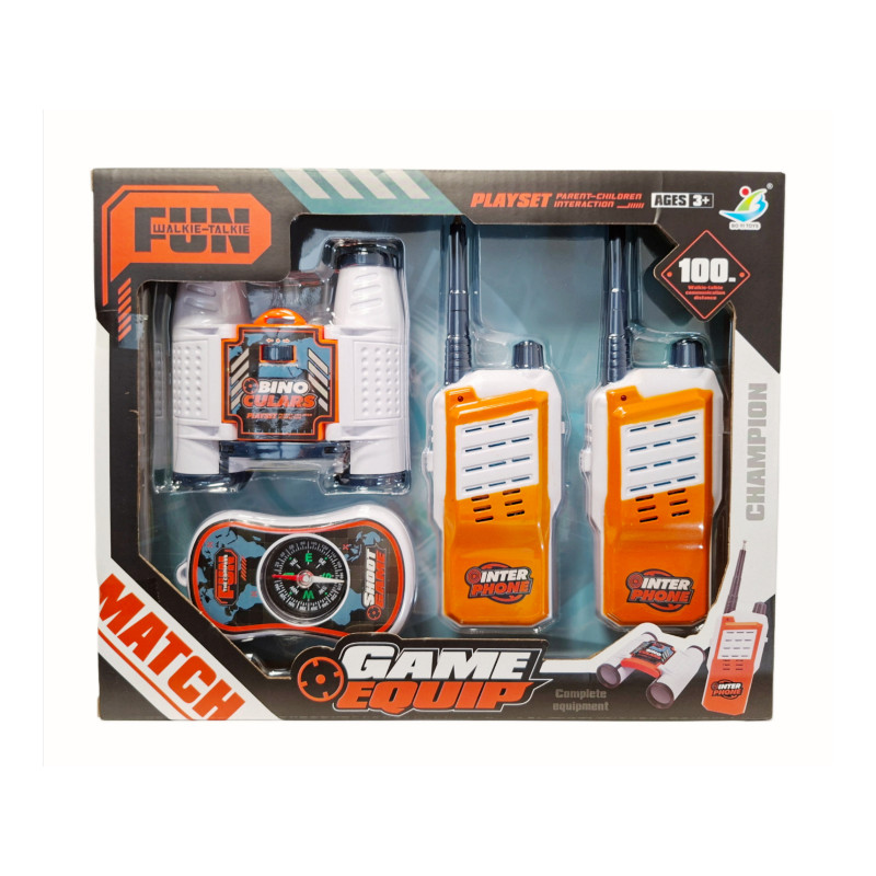 Zestaw walkie-talkie z lornetką i kompasem. Komplet zawiera 4 elementy. Poprzez walkie talkie dzieci będą mogły kontaktować się ze sobą w odległości do 100 metrów. Produkt zapakowany w kartonowe pudełko. Zabawka przeznaczona dla dzieci od lat 3. Zabawka działa na baterie typu AA. Baterie nie są załączone do zabawk