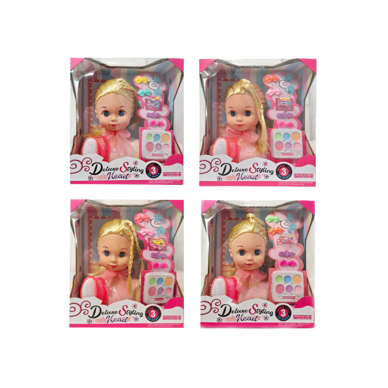 Zestaw głowa do stylizacji z akcesoriami. Produkt pomoże dzieciom ćwiczyć paluszki, a także pomoże poznać `tajniki` jak zrobić oryginalną fryzurę. Do głowy dołączono także m.in.: kolorowe spinki (m.in. kokardki, delfinki) i gumki, szczotkę i grzebień do włosów, cienie do powiek. Kosmetyki służą do malowania zabawek. Produkt zapakowany w kartonowe opakowanie. Produkt występuje w kilku wersjach kolorystycznych, wybierany losowo. Cena dotyczy jednej sztuki. Zabawka dla dzieci od 3 lat. Podane wymi