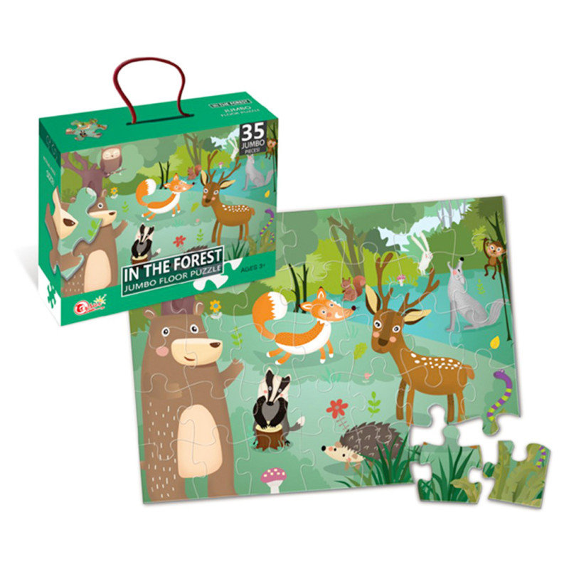 Puzzle podłogowe jumbo wykonane z tektury. Zestaw składa się z 35 elementów. Puzzle z wizerunkiem zwierząt leśnych. Zabawka przeznaczona dla dzieci od lat 3. Produkt zapakowany w kartonowe pudełko. Podane wymiary są wymiarami opakowania