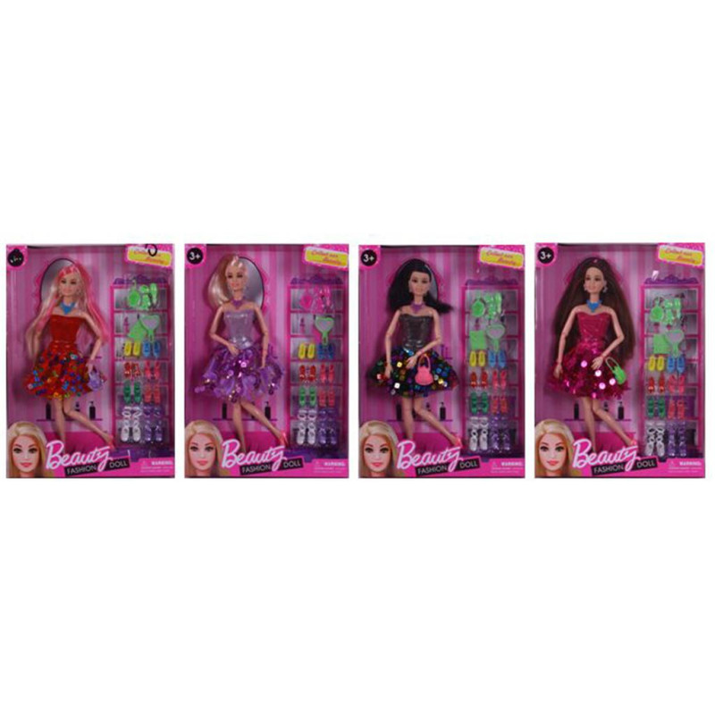 Lalka w pudełku z akseroriami. W zestawie znajduję sie 8 par butów lusterko grzebień oraz kosmetyki.Lalka posiada zginalne ręce oraz nogi. Wyskoość lalki 30 cm