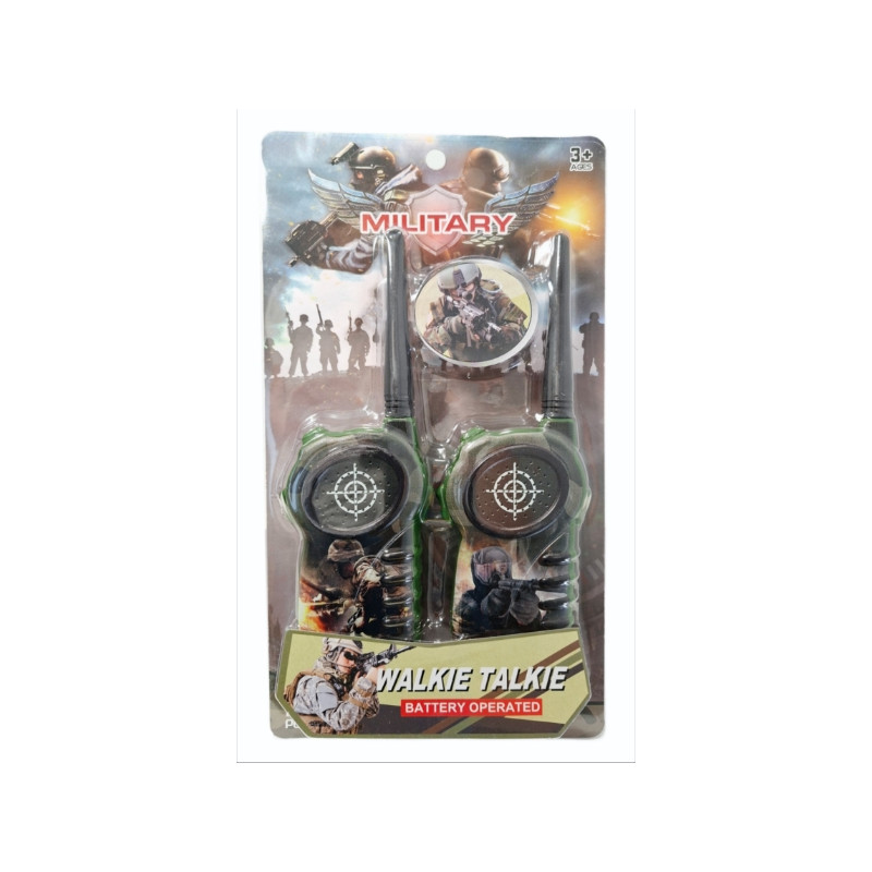 Zestaw krótkofalówek w stylu militarnym, zasilanych bateriami. Zabawka działa na baterie typu AA. Baterie nie są załączone do zabawki. Produkt zapakowany w kartonową podstawkę z przezroczystym kloszem. Podane wymiary są wymiarami opakowania. Zabawka przeznaczona dla dzieci od 3 lat.