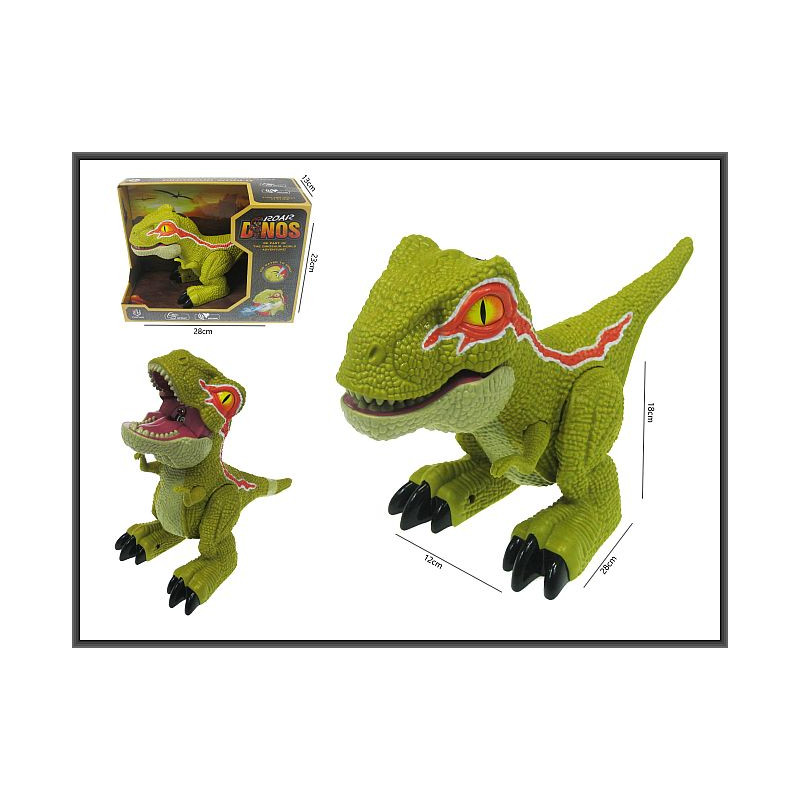 naciśnięciu ogona dinozaur ryczy bardzo realistycznie, z pyska wydobywa mu się