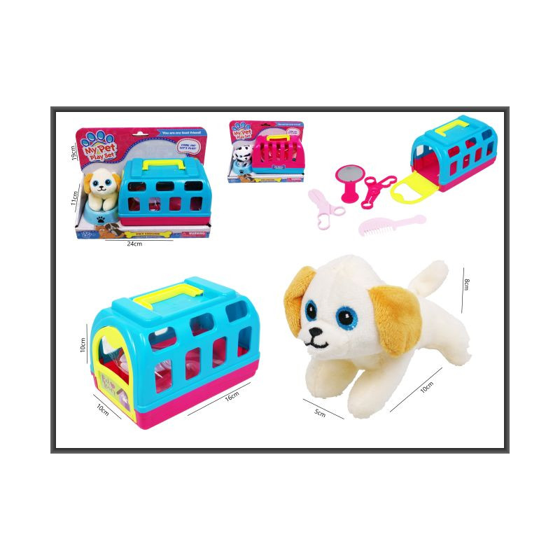 Piesek w nosidełku z akcesoriami