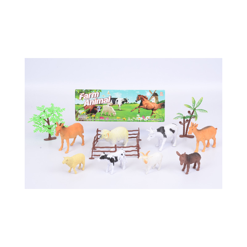 Zestaw figurek zwierząt zapakowanych w woreczek z papierową przywieszką. W opakowaniu znajduje się 8 zwierząt domowych oraz drzewa i płot. Wymiary zwierząt krowa 12cm, baran 10cm, koń 12cm, cielak i owca 7,5cm.