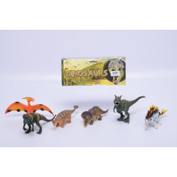 Figurkidinozaurów zapakowane w woreczek z papierową etykietą. Ilość dinozaurów 6 szt w rozmiarze od 16 do 19cm.